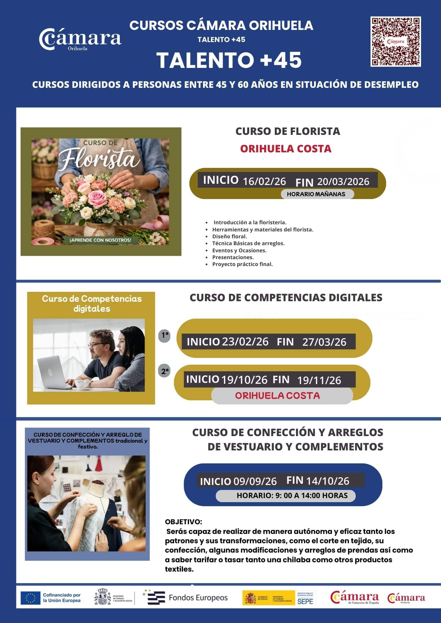 Talento 45+ (45-60 ans) sera lancé avec un Cours d'art floral le 16 février à Orihuela Costa et un Cours de compétences numériques et d'employabilité le 23 février à Orihuela. Les cours post-été comprennent Conception et confection de vêtements (September 9), Maquillage des yeux (September 9), Compétences numériques et employabilité (19 octobre à Orihuela Costa), et Formation à l'utilisation des équipements esthétiques (Octobre 19).