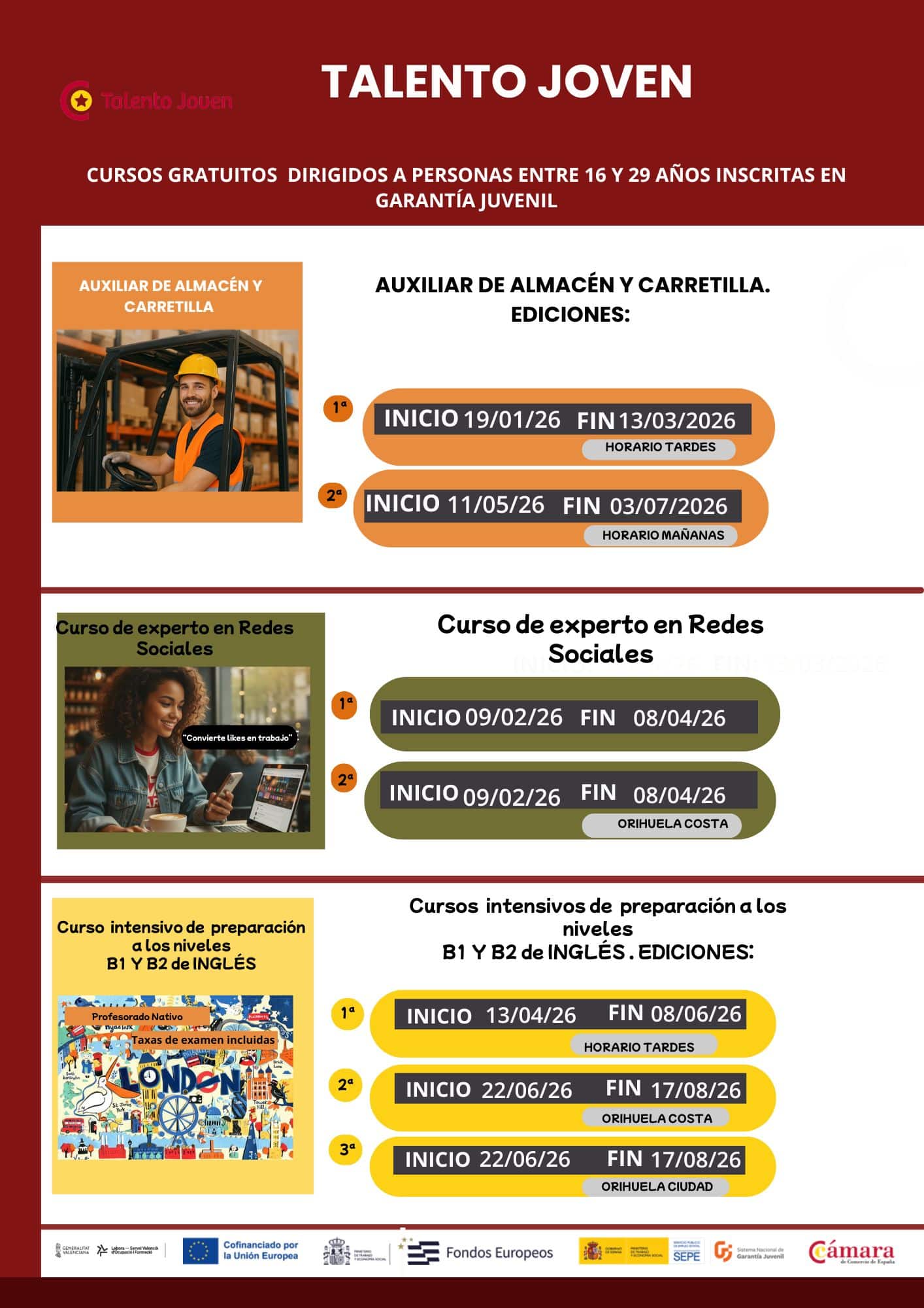 Jeune talent (âgés de 16 à 29 ans) commenceront par un Formation d'expert en médias sociaux Le 9 février, des formations seront proposées à la fois à l'incubateur d'entreprises d'Orihuela et à Orihuela Costa. D'autres formations sont également offertes, notamment une formation de sauveteur débutant le 2 mars à Orihuela et le 13 avril à Orihuela Costa, ainsi qu'une formation certifiée. Moniteur d'activités de loisirs (MAT) Cours débutant le 13 avril. Intensif Cours d'anglais B1 et B2 Des séances seront également proposées, à partir du 13 avril l'après-midi et du 22 juin le matin, sur les deux sites, et ce pendant tout l'été.